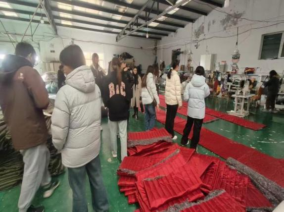 在板式家具生产现场,公司负责人带领师生参观生产全流程。指导学生观察识别国内外不同板材,学习板材品级差异的判断方法,认知贴面材料的不同类型,并带领学生观摩了数控开料机的精准裁切过程,学习了板材开料的尺寸误差控制标准;在封边车间,了解全自动激光封边机的操作流程,掌握不同封边条的选择及封边工艺对环保性、美观度的影响;在钻孔车间,熟悉了排钻设备的定位原理,明确了孔位精度对家具组装稳定性的关键作用。另外还讲解常用板材压膜的类型,材质特性及适用场景等一系列家具制造加工过程。