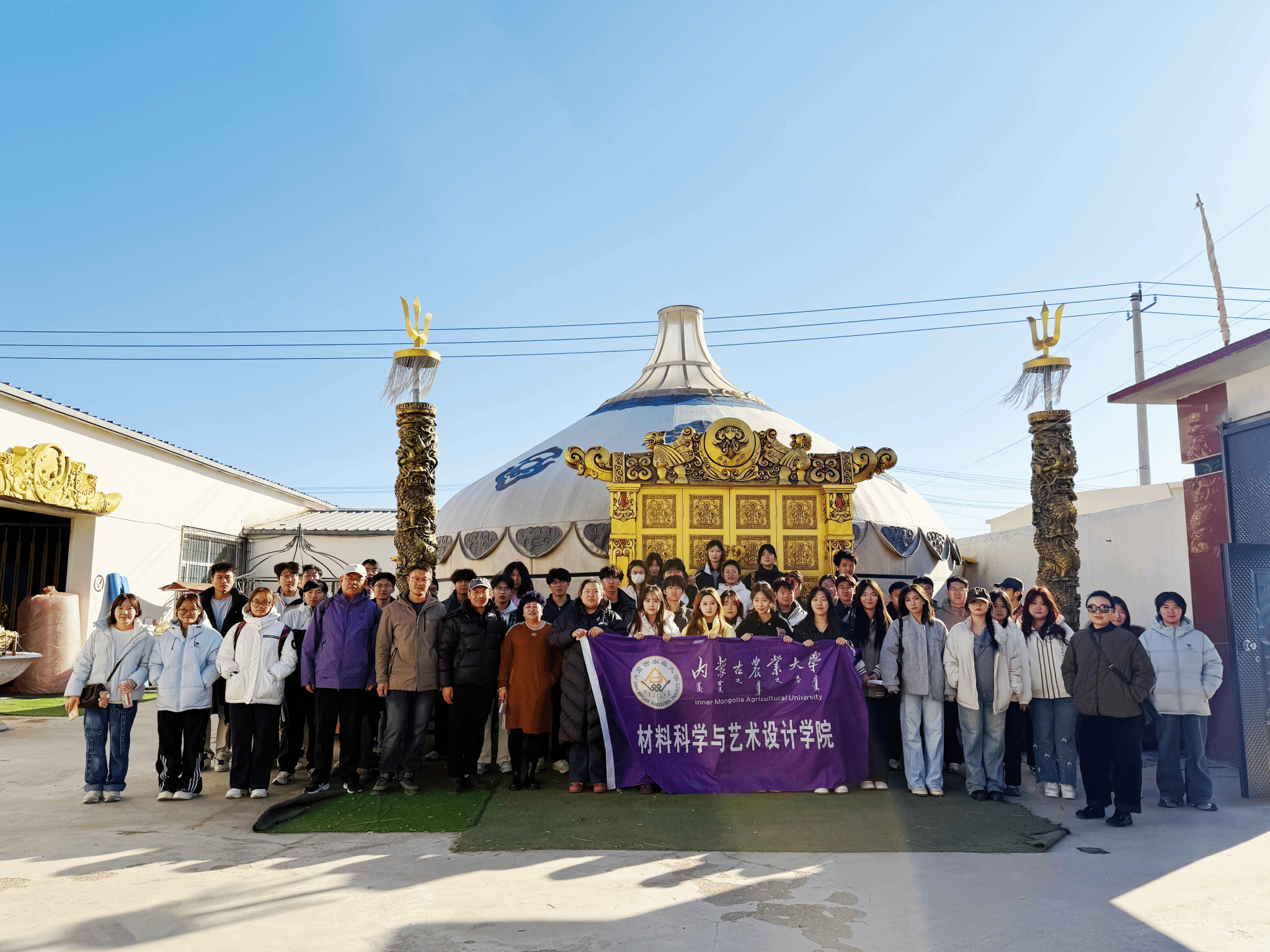 11月13日师生来到内蒙古纳硕泰民族工艺制品公司参观实习。公司核心业务涵盖蒙古包、民族家具、帐篷的加工销售,以及蒙元风格室内外装潢、景观雕塑等服务。本次实习旨在将家具设计与工程专业理论知识与民族家具生产实践结合,深入了解蒙古包、蒙古族传统家具的制作工艺、材料应用及创新设计逻辑;学习非遗技艺与现代设计的融合方法,观察民族用品的产业化运营模式;提升传统元素转化、功能性设计及工程落地能力,为后续产品创新设计积累实践经验。在工作人员和老师的带领下,系统学习蒙元文化对民族家具设计的影响,通过参观产品陈列馆,掌握蒙古包从传统毡包到现代改良款的演变历程,以及蒙古族家具的形制特征与使用场景搭配。实习团队走进车间近距离参观木材的切割、穿孔、雕刻、打磨、上色等系列步骤。