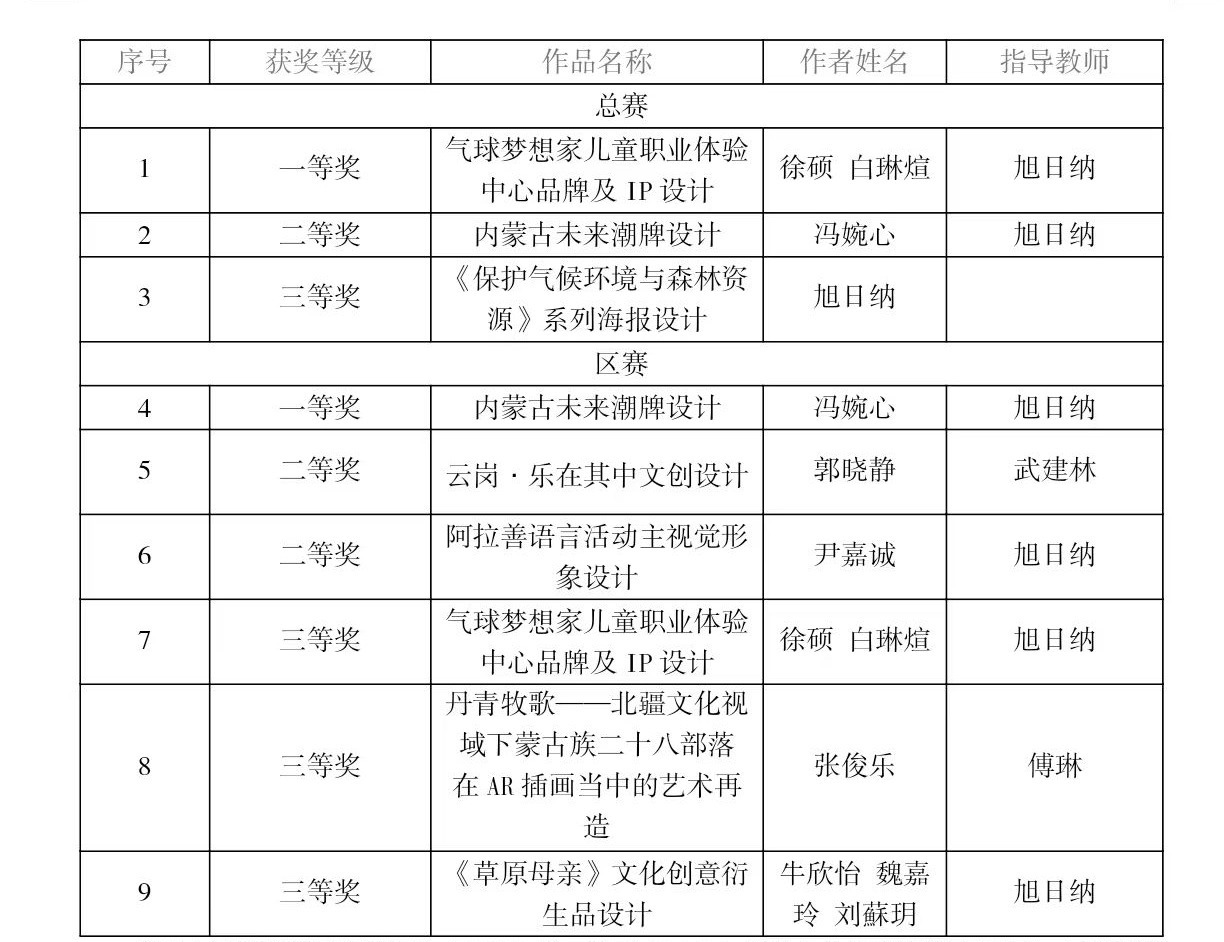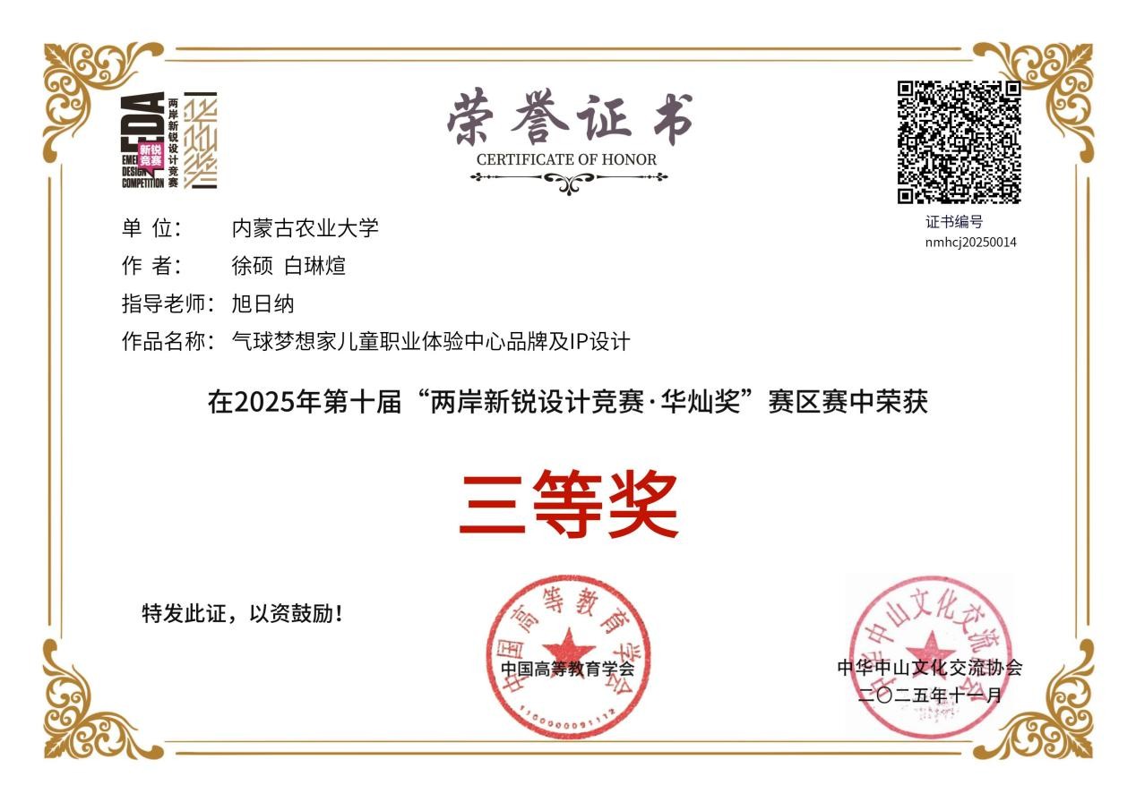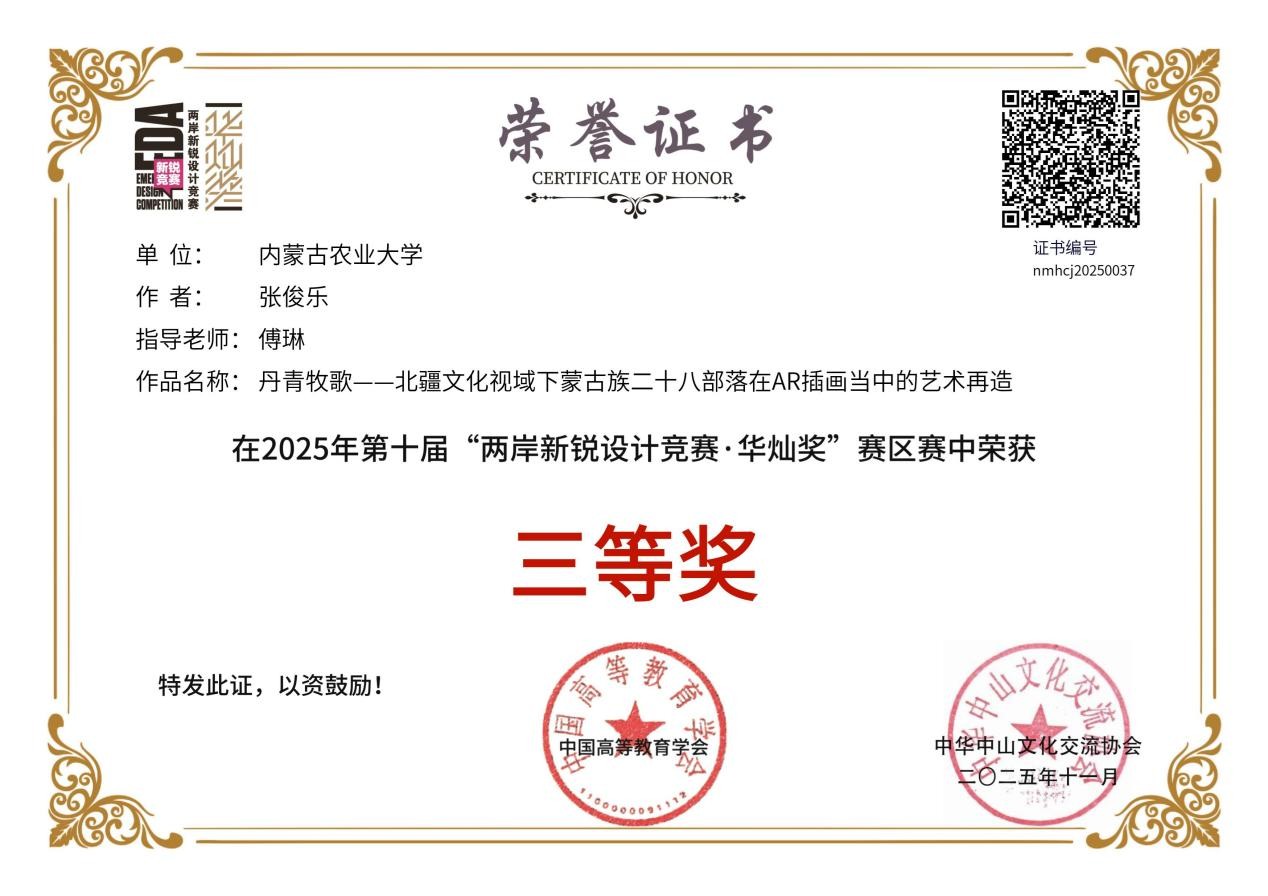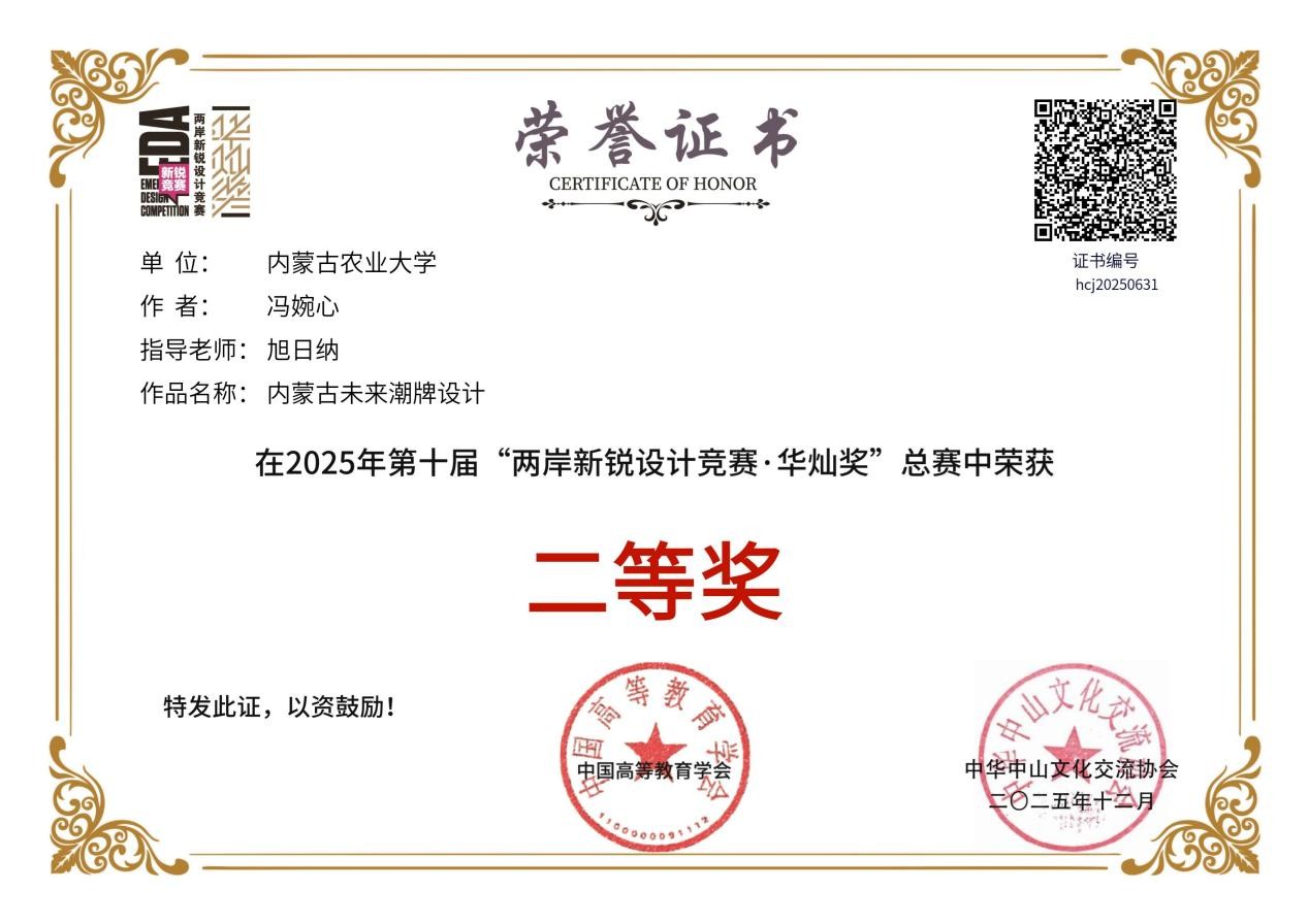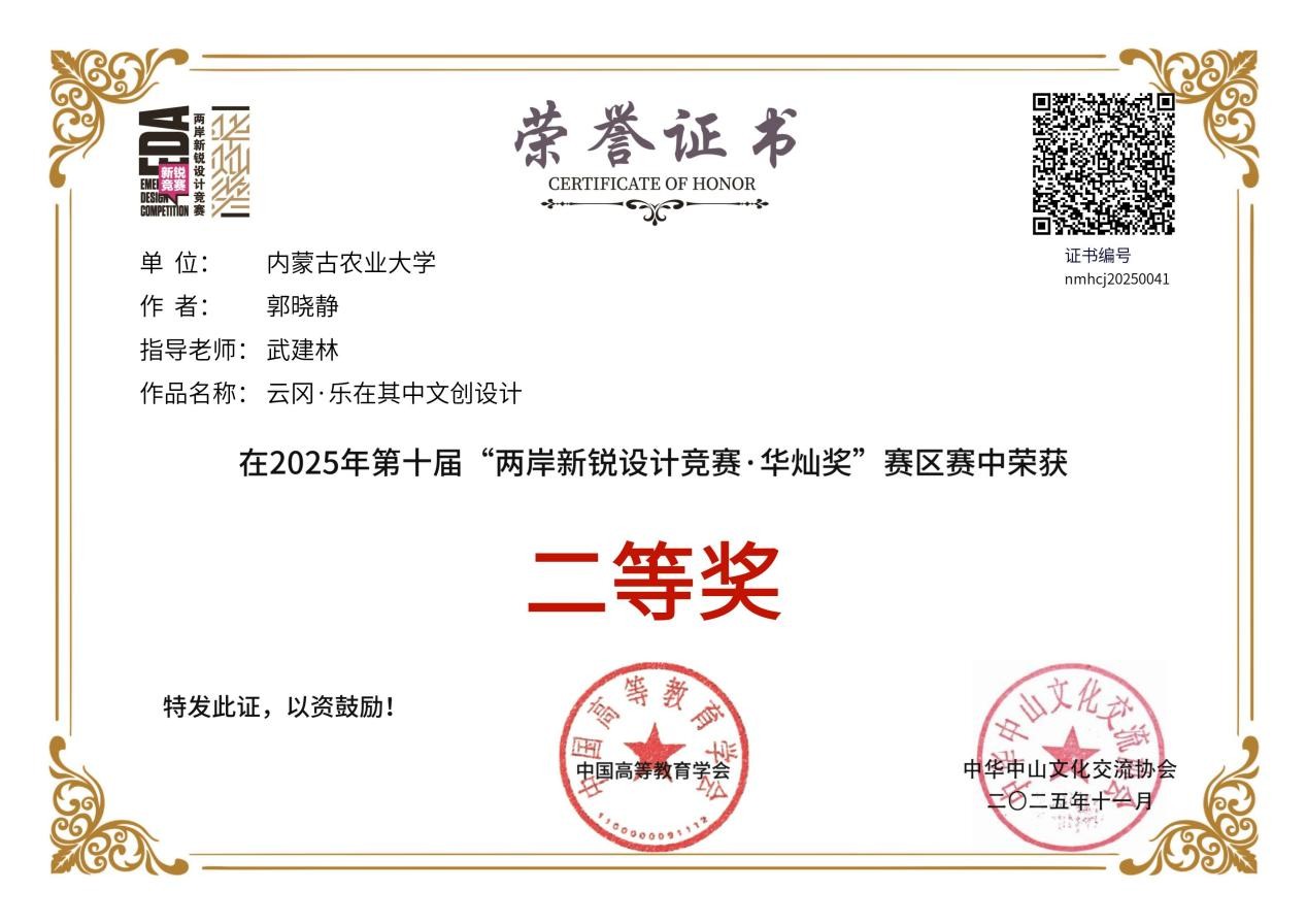 12月10日-12日,第十届“两岸新锐设计竞赛·华灿奖”颁奖仪式在苏州昆山举行。内蒙古农业大学材料科学与艺术设计学院师生受邀参加了本次华灿奖的颁奖及路演系列活动,共获得国赛一等奖1项、二等奖1项、三等奖1项,以及内蒙古自治区赛一等奖、二等奖、三等奖共计6项,涵盖了视觉与空间设计高校学生组、中华传统文化IP开发设计高校学生组、视觉与空间设计青年设计师组等多个组别。
