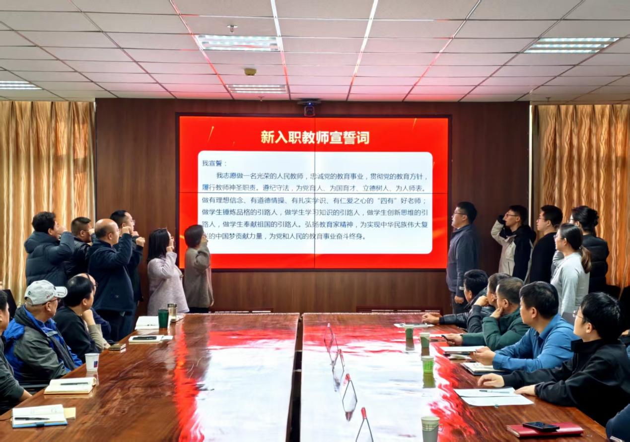 在副院长张燕的领誓下,新入职教师佩戴校徽、高举右手,许下了庄严的入职誓言。