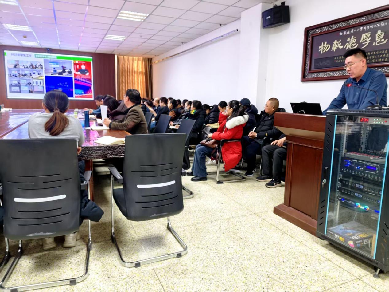岁序更替,华章日新。2026年1月6日下午,学院2025年度工作总结大会在庄严而热烈的氛围中隆重举行。会议全面回顾了过去一年的奋斗历程与丰硕成果,展望了新一年的发展蓝图,并举行了温馨而隆重的新教师入职仪式。副校长张超群、教务处处长姚利宏、人事处处长于涛、科技处副处长蒙仲举、研究生院副院长李国龙、乡村振兴研究院副院长高兵、学院党政领导班子、学院全体教职工出席本次会议,学院党委书记屈丰富主持会议。